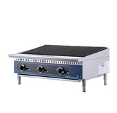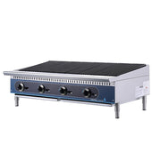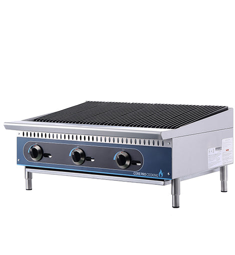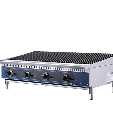 An American gas charbroiler is a cooking appliance commonly found in commercial kitchens, particularly in restaurants, diners, and barbecue joints. It's designed for grilling meats, seafood, and vegetables over an open flame or radiant heat source, typically powered by gas burners.